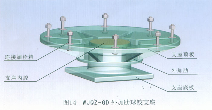 6.3外加肋球鉸支座. 支座結(jié)構如圖14所示。支座由支座頂板、外加肋、支座底板、支座內(nèi)腔和連接螺栓構成。外加肋在這里只是介紹一個概念,它可以用于以上任何一種類型的支座,其作用主要是增強支座的剛度,美化支座的外形。極大的減小了囚載荷、風力.、地震力、溫度變化對支座造成的破壞。外加肋的設置,加強了支座抗彎、剪、拔的能力。也使得支座外露情況下,成為美化建筑整體的一個亮點。特別是在鋼結(jié)構建筑中,它使得建筑向和諧化、人文化邁出了可喜的一步。