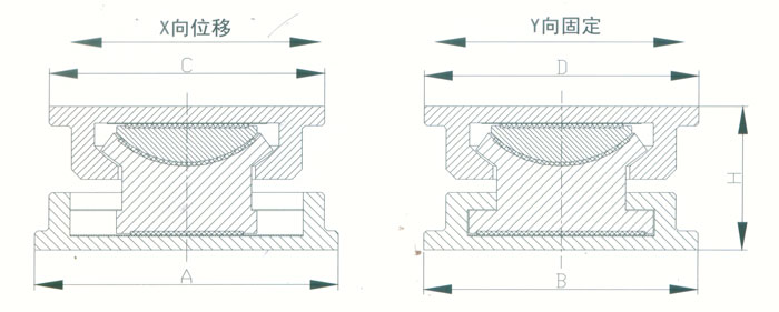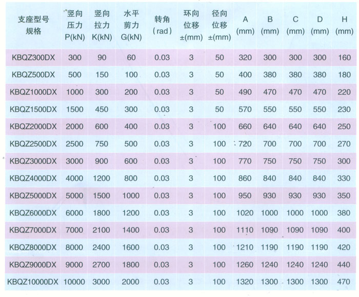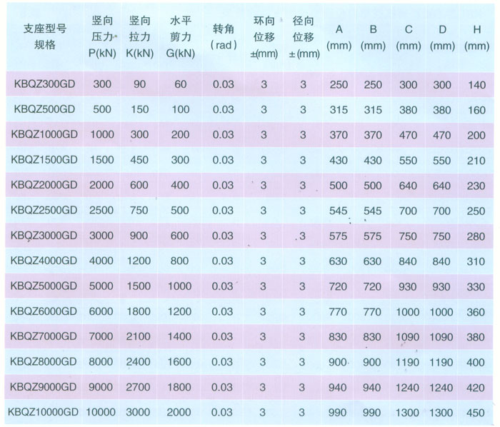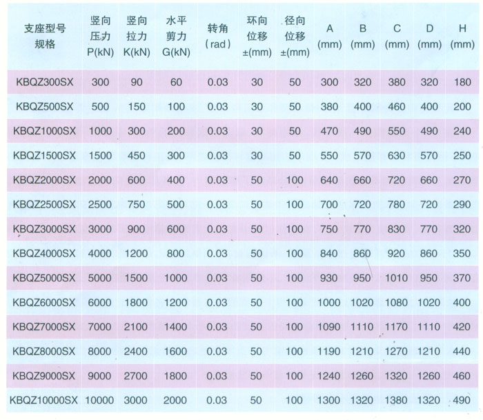 4 KBQZ系列抗拔球型支座 本系列支座主要分為抗拔球型支座和減震抗拔球型支座,下面對其進(jìn)行分類介紹。4.1抗拔球型支座 此類支座分為固定型、單向位移型和雙向位移型,支座結(jié)構(gòu)如圖3。其主要由支座頂板、不銹鋼板、平面聚四氟乙烯滑板、球冠襯板、球面聚四氟乙烯滑板、中支架、聚四氟乙烯滑板、不銹鋼板和滑移箱組成。支座中的相對滑移部件之間,采用目前世界上摩擦系數(shù)最低的聚四氟乙烯滑板和不銹鋼板相隔,充分減小了摩擦阻力,使各部分之間的運動流暢,避免爬行現(xiàn)象的產(chǎn)生。本類支座通過球面聚四氟乙烯滑板上部構(gòu)件沿著球面相對于下部構(gòu)件的轉(zhuǎn)動實現(xiàn)轉(zhuǎn)角(常用值為0.02rad),在工作過程中支座沿著滑移箱滑道滑動實現(xiàn)水平位移。 豎向壓力的傳遞是通過支座頂板,不銹鋼板,平面聚四氟乙烯滑板,球冠襯板,球面聚四氟乙烯滑板,中支架,聚四氟乙烯滑板,不銹鋼板依次疊加傳至滑移箱底板。 豎向拔力的傳遞是通過支座頂板和中支架的抗拔接觸面將作用于支座頂板上的上.拔力傳至中支架,再由中支架與滑移箱之間的抗拔四氟滑板和不銹鋼板將力傳至滑移箱頂板。 水平力的傳遞是通過支座頂板側(cè)壁與中支架側(cè)壁之間.的接觸面將水平力傳至中支架,再由中支架與滑移箱的接觸面?zhèn)髦粱葡鋫?cè)壁根部。 固定型抗拔球型支座不設(shè)滑移箱。4.1.1普通抗拔雙向位移型球型支座KBQZ-SX普通抗拔雙向位移型球型支座參數(shù)表 表74.1.2普通抗拔單向位移型球型支座KBQZ-DX普通抗拔單向位移型球型支座參數(shù)表 表84.1.3普通抗拔固定型球型支座KBQZ-GD普通抗拔固定型球型支座選用參數(shù)表 表9